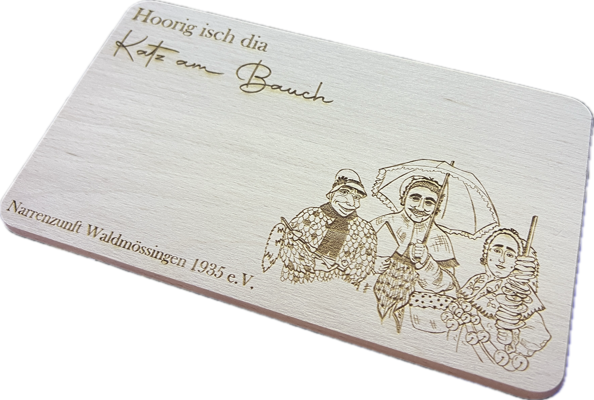 Fasnets Premium Brettchen mit Waldmössinger Narren "Hoorig isch dia Katz am Bauch".